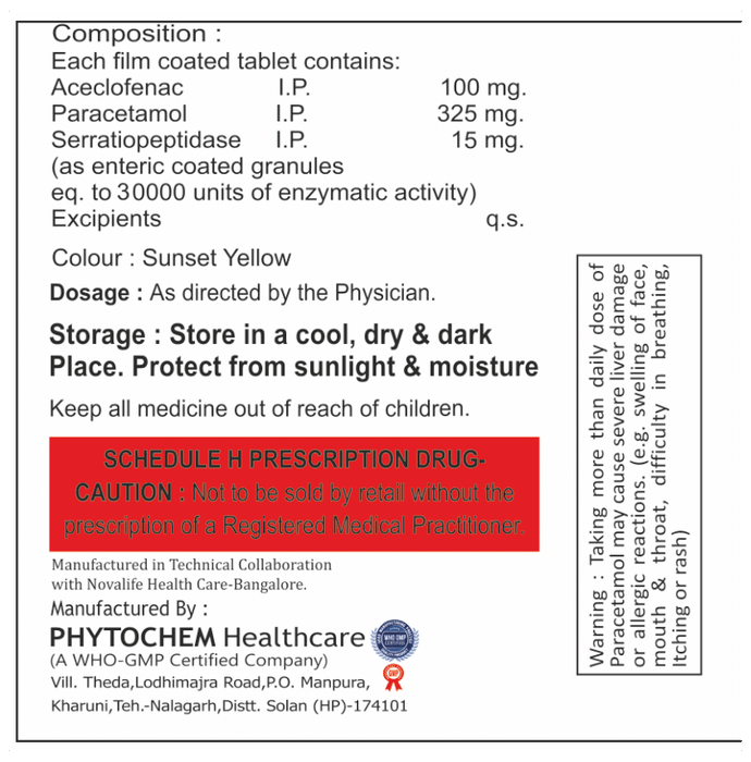 Marketer:Boffo Pharmaceutical Pvt Ltd,Composition:Aceclofenac (100mg) + Paracetamol (325mg) + Serratiopeptidase (15mg), medicine_typedrugs,Packaging Detail:strip of 10 tablets,          Package:Strip,Qty:10,Product Form:Tablet, prescription_required:Prescription Required,primary_use: