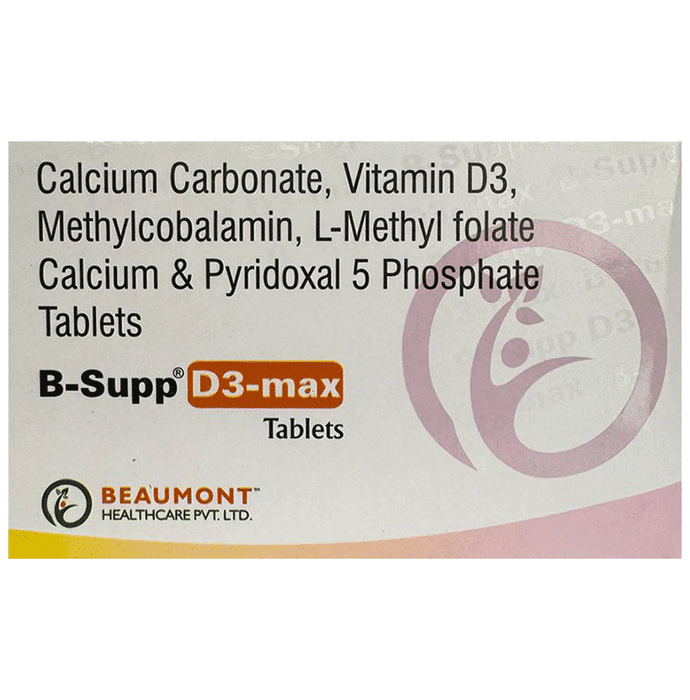 description:B-Supp D3-max Tablet is a combination medicine used to treat nutritional deficiencies. It is normally prescribed when your diet alone cannot provide the necessary supplements your body needs. It fulfills the deficiency to prevent related diseases. It also ensures proper growth and functioning of the body. B-Supp D3-max Tablet may be taken with or without food. Take it in the dose and duration advised by the doctor. Take it regularly at the same time each day to get maximum benefits from it. Do not take it more than or longer than prescribed by the doctor, as that may cause harmful effects.It is generally safe medicine with little or no side effects. However, some people may experience dryness in the mouth, nausea, abdominal pain, constipation, and headache on taking the medicine. If you experience any such side effects which do not go away on their own or get worse, let your doctor know. It is important to let your doctor know if you have any preexisting medical conditions or if you are taking any other medications. This will ensure your safety to use this medicine.