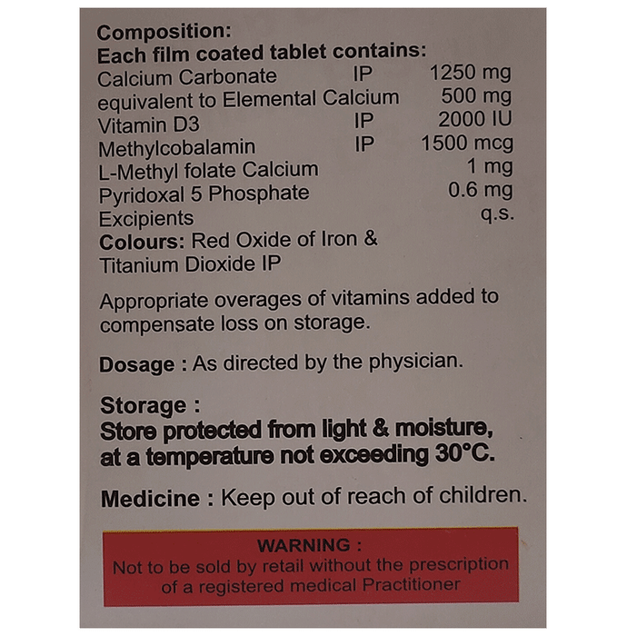 Marketer:Beaumont Healthcare Pvt Ltd,Composition:Calcium Carbonate (1250mg) + Vitamin D3 (2000IU) + Methylcobalamin (1500mcg) + L-Methyl Folate Calcium (1mg) + Pyridoxal-5-phosphate (0.6mg), medicine_typedrugs,Packaging Detail:strip of 10 tablets,                   Package:Strip,Qty:10,Product Form:Tablet, prescription_required:,primary_use:
