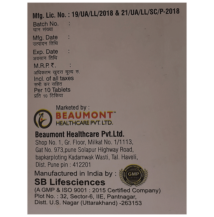 Manufacturer details:,                                                                     Marketer details:Beaumont Healthcare Pvt Ltd | shop no 1 Gr floor , milkat no 1/1113 gate no 973 Pune soalpur highway ,WASTLI TAL , HAVELI disttvnPune 412201