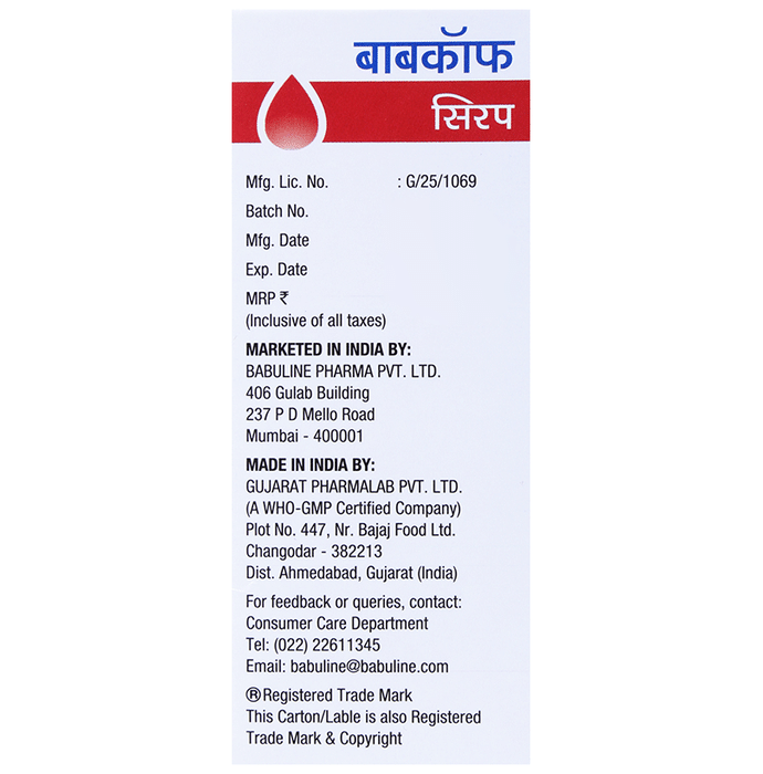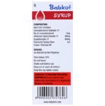 description:Babkof Syrup is used in the treatment of cough with mucus. It thins mucus in the nose, windpipe and lungs, making it easier to cough out. It also provides relief from runny nose, sneezing, itching, and watery eyes. Babkof Syrup is taken with or without food in a dose and duration as advised by the doctor. The dose you are given will depend on your condition and how you respond to the medicine. You should keep taking this medicine for as long as your doctor recommends. If you stop treatment too early your symptoms may come back and your condition may worsen. Let your healthcare team know about all other medications you are taking as some may affect, or be affected by this medicine.The most common side effects are dizziness, vomiting, change in taste, diarrhea, headache, and rashes. Most of these are temporary and usually resolve with time. Contact your doctor straight away if you are at all concerned about any of these side effects. This medicine can also cause sleepiness, so do not drive or do anything that requires mental focus until you know how this medicine affects you. Avoid drinking alcohol while taking this medicine as it can make sleepiness worse.Never support self-medication or recommend your medicine to another person. It is beneficial to have plenty of fluids while taking this medication. Before taking this medicine, you should tell your doctor if you are pregnant, planning pregnancy or breastfeeding. You should also tell your doctor if you have any kidney or liver diseases so that your doctor can prescribe a suitable dose for you.