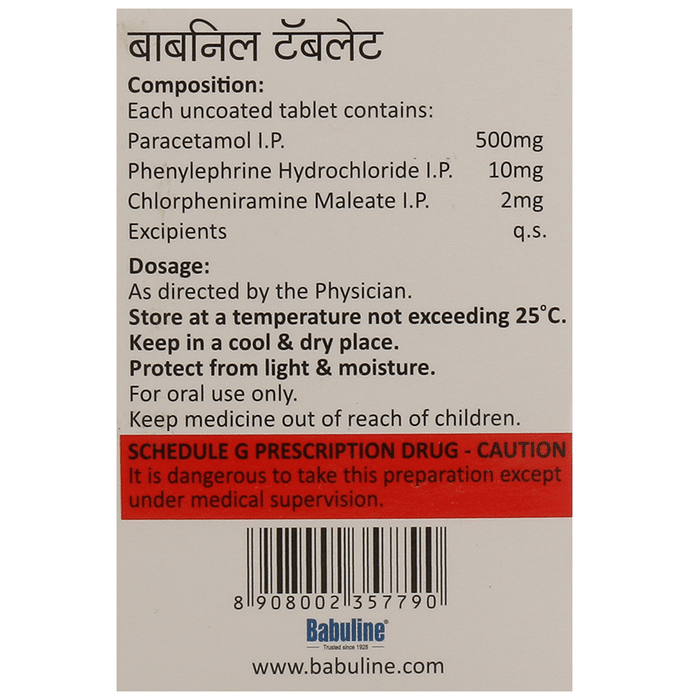 description:Babnyl Tablet is a medicine used in the treatment of common cold symptoms. It provides relief from symptoms such as headache, sore throat, runny nose, muscular pain, and fever. Babnyl Tablet can be taken with or without food. The dose and duration will depend on the severity of your condition. You should keep taking the medicine even if you feel better until the doctor says it is alright to stop using it.Using this medicine may cause a few common side effects such as nausea, vomiting, sleepiness, dizziness, and headache. If any of these side effects do not resolve with time or get worse, you should let your doctor know. Your doctor may be able to suggest ways of preventing or reducing the side effects. In general, you should try to use the smallest amount necessary to control your symptoms.Before using the medicine, you should tell your doctor if you have any other medical conditions or disorders. To make sure it is safe, you should let your doctor know all the other medicines you are taking. Also, tell your doctor if you have any problems with the liver or kidneys. Avoid consumption of alcohol while on treatment with this medicine as it may increase the chance of some side effects. Pregnant and breastfeeding women should consult their doctors first before using the medicine.