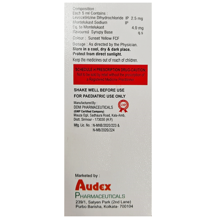 Marketer:Audex Pharmaceuticals,Composition:Levocetirizine (2.5mg/5ml) + Montelukast (4mg/5ml),                       medicine_type:drugs,