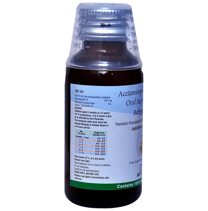 description:Babygesic 125 Oral Suspension is a widely prescribed medicine that helps to ease pain and bring down high body temperature (fever). In children, it treats conditions like headache, toothache, body ache, fever, and common cold. Babygesic 125 Oral Suspension is given orally preferably at a fixed time every day. Though this medicine can be taken before or after food, it is best given after food as it can irritate the inner lining of an empty stomach. The dose and duration will depend upon your child’s age, body weight, and severity of the infection, so stick to the dose, time, and way prescribed by your child’s doctor. If your child vomits within 30 minutes of taking the medicine, let the child calm down and repeat the same dose. Redosing is not recommended if your child gets sick more than 30 minutes after taking a dose.Do not give your child Babygesic 125 Oral Suspension along with other medicines (many cold and flu medicines and other painkillers) that contain paracetamol, as this may result in overdosing and cause dangerous side effects such as hepatotoxicity (liver damage). Always check the ingredients of any other medicines before giving them to your child in combination with this medicine.Generally, this medicine is well-tolerated by the children. However, temporary side effects such as indigestion, nausea, and vomiting may occur in some children. Consult your doctor in case these episodes become bothersome for your child.This medicine is often considered safe and effective but may not be suitable for everybody. Inform your doctor if your child is undergoing treatment for any blood-related disorder, is allergic to any medicinal compound, or has any birth defects, liver impairment, or kidney dysfunction. This will help your child’s doctor evaluate the dose and suitability of this medicine in a better way.