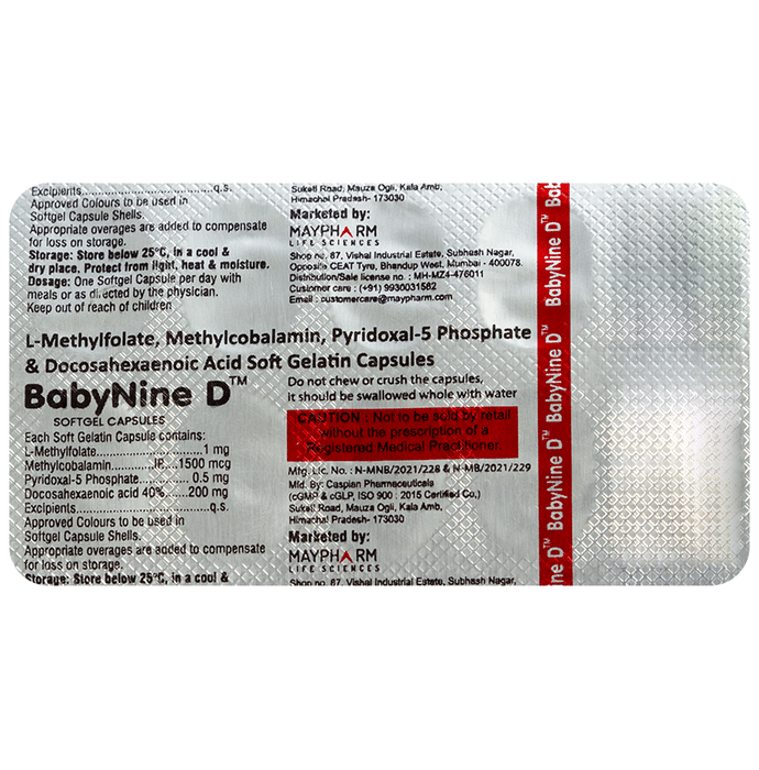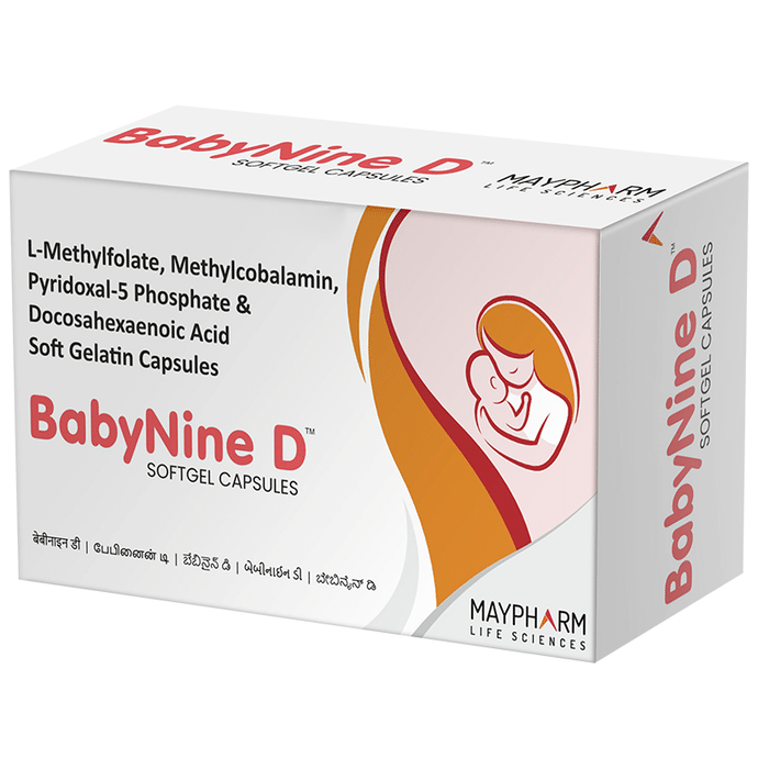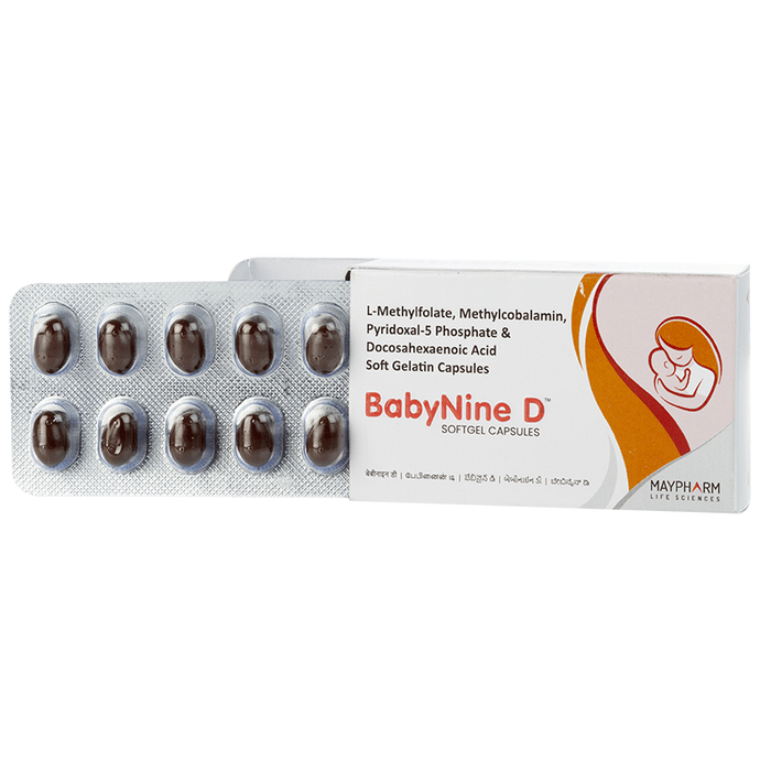 description:Babynine D Softgel Capsule is a combination of nutritional supplements prescribed to treat nutritional deficiencies in the body. It ensures the proper growth and functioning of the body and strengthens immunity. Babynine D Softgel Capsule may be taken with or without food. However, take it in the dose and duration prescribed by your doctor. It is also advised to take this medicine at a fixed time to avoid missing a dose.It is usually a safe medicine with very minimal or no side effects. However, if you experience any unusual symptoms while taking the medicine, consult your doctor. They may be able to help you by adjusting the dose or prescribing you an alternative medicine.Before taking Babynine D Softgel Capsule, tell your doctor if you have any other health conditions. Inform them if you are taking any other medicines or are pregnant or breastfeeding. It is also advised to stop alcohol intake after taking this medicine.