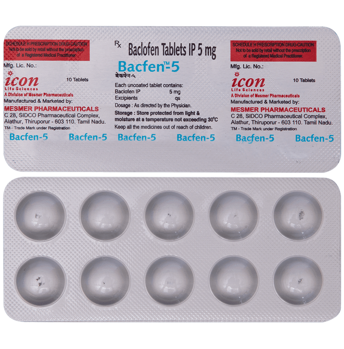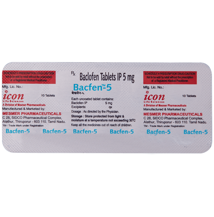 description:Bacfen 5 Tablet is a muscle relaxer. It is used to treat muscular symptoms such as rigidity, tension, and stiffness that may occur due to various conditions such as cerebral palsy, multiple sclerosis, motor neuron disease, or injury to the head, brain, or spine. Bacfen 5 Tablet can be taken with food. In general, you should try to use the smallest amount necessary to control your symptoms, for the shortest possible time. You should take this medicine regularly while you need it. Try not to miss doses as this will make the medicine less effective.Some common side effects of this medicine include fatigue, weakness, drowsiness, and dizziness. If any of these side effects do not go away or get worse, you should let your doctor know. Your doctor may be able to suggest ways of preventing or reducing the symptoms.To make sure it is safe for you, before taking this medicine, let your doctor know if you have any medical conditions or disorders. You should also tell your doctor all the other medicines you are using or taking. Pregnant and breastfeeding women should consult their doctors before using this medicine.