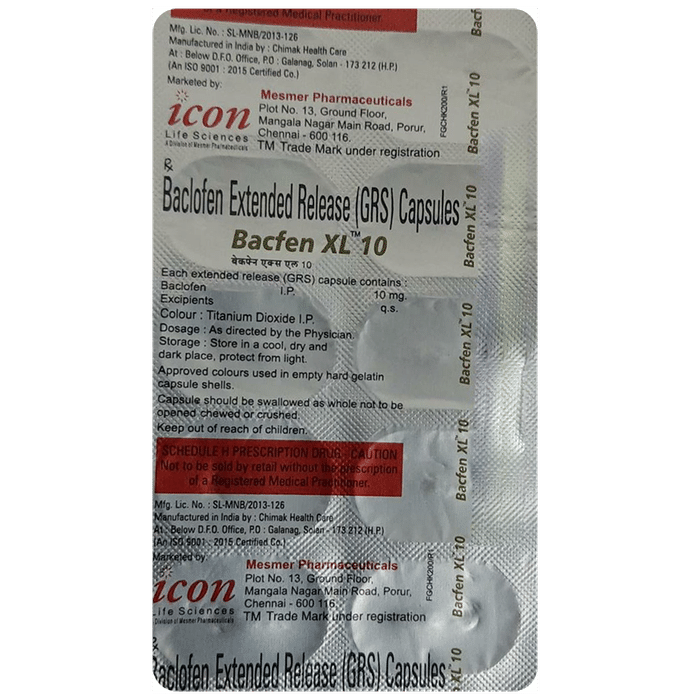 description:Bacfen XL 10 Capsule is a muscle relaxer. It is used to treat muscular symptoms such as rigidity, tension, and stiffness that may occur due to various conditions such as cerebral palsy, multiple sclerosis, motor neuron disease, or injury to the head, brain, or spine. Bacfen XL 10 Capsule can be taken with food. In general, you should try to use the smallest amount necessary to control your symptoms, for the shortest possible time. You should take this medicine regularly while you need it. Try not to miss doses as this will make the medicine less effective.Some common side effects of this medicine include fatigue, weakness, drowsiness, and dizziness. If any of these side effects do not go away or get worse, you should let your doctor know. Your doctor may be able to suggest ways of preventing or reducing the symptoms.To make sure it is safe for you, before taking this medicine, let your doctor know if you have any medical conditions or disorders. You should also tell your doctor all the other medicines you are using or taking. Pregnant and breastfeeding women should consult their doctors before using this medicine.