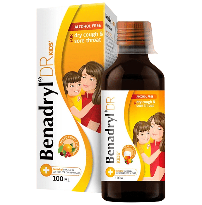 description:Benadryl DR Kids Syrup Mixed fruit flavour Alcohol Free is an antitussive medicine. It is used for the treatment of dry cough. It helps by reducing the activity of the cough center in the brain. This medicine is taken by mouth with or without food. You should take it in a proper dose and duration as advised by the doctor. Remember dosage is decided on the basis of type of medicine (syrup or lozenge), age and present medical condition of the person. It is important to finish the full course of treatment even if you feel better. In case you have missed any dose, take it as soon as you remember it. Its beneficial to have plenty of fluids while taking this medication. It is important to note that you should never support self medication or recommend your medicine to other person. Keep out of reach of children as overdose of this medicine can be dangerous. This medicine may cause dizziness as a side effect, so do not drive or do anything that requires mental focus. Rashes and diarrhea may also occur in many individuals.