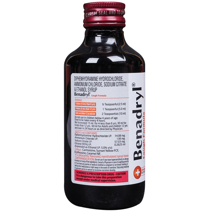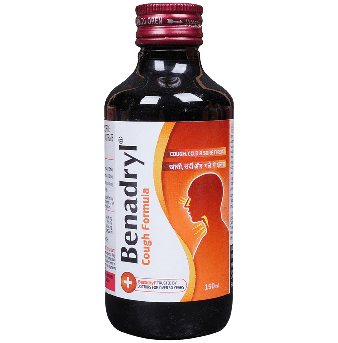description:Benadryl Syrup is used in the treatment of cough. It relieves allergy symptoms such as runny nose, stuffy nose, sneezing, watery eyes, and congestion or stuffiness. It also thins mucus in the nose, windpipe, and lungs, making it easier to cough out. Benadryl Syrup is taken with or without food in a dose and duration as advised by the doctor. The dose you are given will depend on your condition and how you respond to the medicine. You should keep taking this medicine for as long as your doctor recommends. If you stop treatment too early your symptoms may come back and your condition may worsen. Let your healthcare team know about all other medications you are taking as some may affect, or be affected by this medicine.The most common side effects of this medicine include stomach pain, coordination impaired, thickened respiratory tract secretions, and allergic reactions. Most of these are temporary and usually resolve with time. Contact your doctor straight away if you are at all concerned about any of these side effects. This medicine may cause dizziness and sleepiness, so do not drive or do anything that requires mental focus until you know how this medicine affects you. Avoid drinking alcohol while taking this medicine as it can make dizziness worse.Never support self-medication or recommend your medicine to another person. It is beneficial to have plenty of fluids while taking this medication. Before you start taking this medicine it is important to inform your doctor if you are suffering from liver or kidney disease. You should also tell your doctor if you are pregnant, planning pregnancy, or breastfeeding.