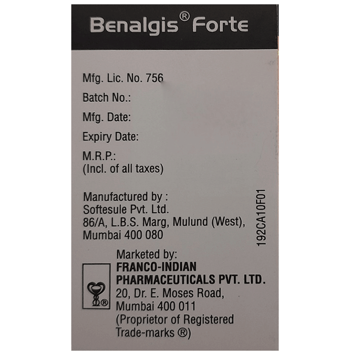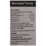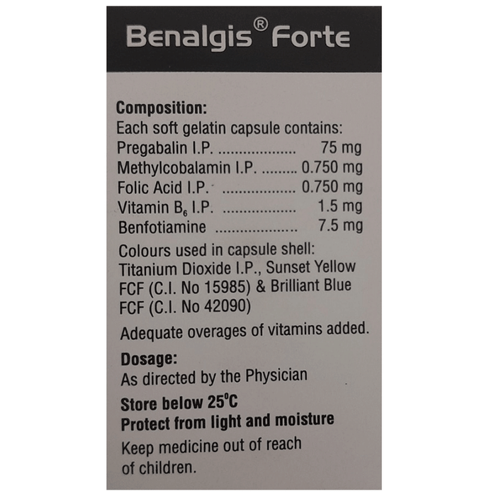 description:Benalgis Forte Soft Gelatin Capsule is a prescription medicine that helps relieve neuropathic pain (pain from damaged nerves). It strengthens the nerves and relieves nerve pain. Benalgis Forte Soft Gelatin Capsule can be taken with or without food. It should be used in the dose and duration as prescribed by your doctor. It is advised to take this medicine at a fixed time. Do not take more than the recommended dose.Benalgis Forte Soft Gelatin Capsule is usually safe with very minimal side effects. However, if you experience severe diarrhea, vomiting, constipation, or any signs of an allergic reaction, please consult your doctor. Also, before taking this medicine, tell your doctor about all other health conditions that you have.Inform your doctor if you are taking any other medicines or if you are pregnant or breastfeeding. It is not advised to drive after taking this medicine as it may cause sleepiness or dizziness and may affect your ability to concentrate and react.