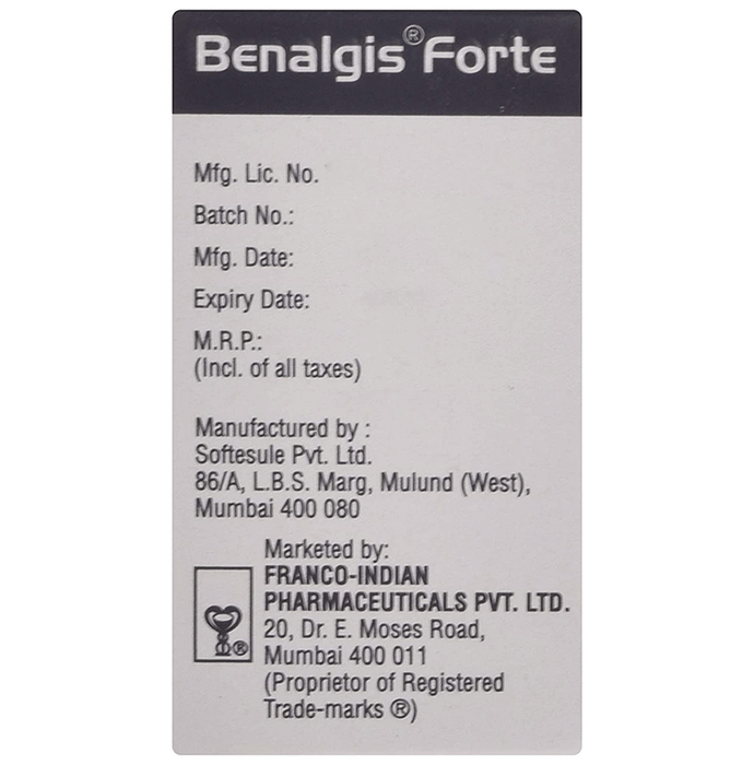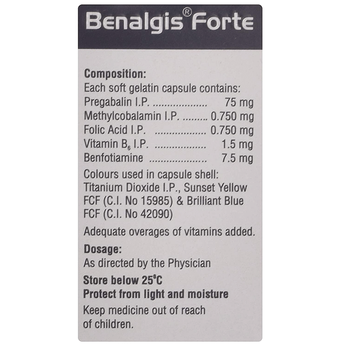 description:Benalgis Forte Soft Gelatin Capsule is a prescription medicine that helps relieve neuropathic pain (pain from damaged nerves). It strengthens the nerves and relieves nerve pain. Benalgis Forte Soft Gelatin Capsule can be taken with or without food. It should be used in the dose and duration as prescribed by your doctor. It is advised to take this medicine at a fixed time. Do not take more than the recommended dose.Benalgis Forte Soft Gelatin Capsule is usually safe with very minimal side effects. However, if you experience severe diarrhea, vomiting, constipation, or any signs of an allergic reaction, please consult your doctor. Also, before taking this medicine, tell your doctor about all other health conditions that you have.Inform your doctor if you are taking any other medicines or if you are pregnant or breastfeeding. It is not advised to drive after taking this medicine as it may cause sleepiness or dizziness and may affect your ability to concentrate and react.