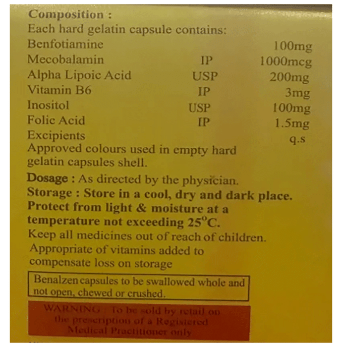 Marketer:Zeno Healthcare,Composition:Alpha Lipoic Acid (200mg) + Benfotiamine (100mg) + Inositol (100mg) + Methylcobalamin (1500mcg) + Vitamin B6 (Pyridoxine) (3mg),                       medicine_type:drugs,
