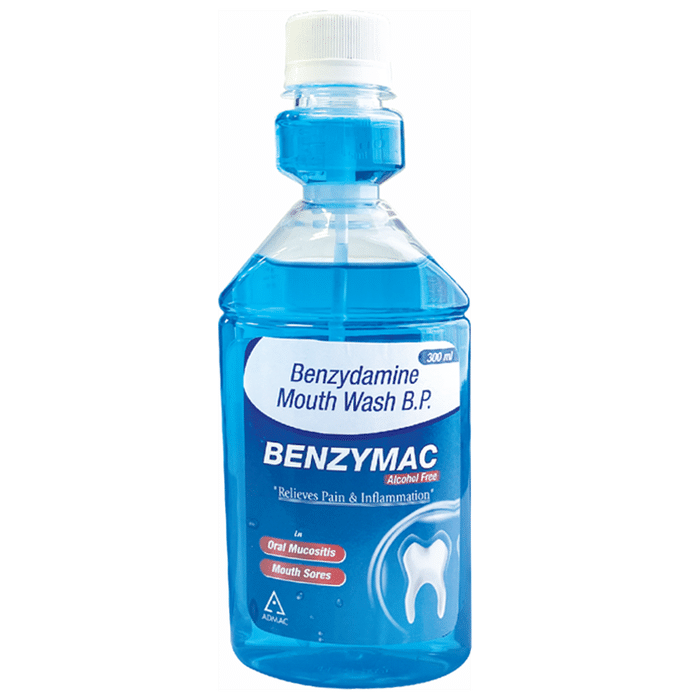 Benzymac Mouth Wash Alcohol Free is a pain relieving medicine. It is used to relieve pain, discomfort, and inflammation of the mouth, gums, and throat. It provides relief from pain and swelling and aids in speeding up the healing process. Benzymac Mouth Wash Alcohol Free should be used strictly as advised by your doctor. Use it in the dose and duration as directed by your doctor. You should not use more medicine or apply it more often than prescribed by your doctor. This will not make it work any faster and may increase side effects.It is usually safe with little or no side effects. However, it may cause burning sensation and skin irritation at the site of application in some people. These are usually temporary and resolve with time. If they do not get better with time or worsen, you should let your doctor know. Your doctor may be able to suggest ways of preventing or reducing the symptoms.Before using the medicine, it is important to tell your doctor if you are using or have recently used any other medicines for the same condition or other diseases. To make sure the medicine is safe, pregnant and breastfeeding women should consult their doctor before using the medicine.