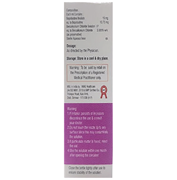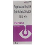 Bepline 1.5% Eye Drop belongs to a group of medicines called antihistamines. It is used in the treatment of itching associated with inflammation in the eyes (redness and swelling) caused due to allergy. Follow your doctor’s instructions precisely for administering Bepline 1.5% Eye Drop in the eye. It should be used regularly at evenly spaced time intervals as prescribed by your doctor. Do not skip any doses and finish the full course of treatment even if you feel better. Stopping the medicine too early may lead to returning or worsening.Commonly seen side effects seen with Bepline 1.5% Eye Drop include eye irritation, headache, and nasopharyngitis. Consult your doctor if these side effects persist or if your condition worsens. It may cause blurring of your vision for a short time just after its use, so do not drive until your vision is clear.