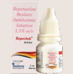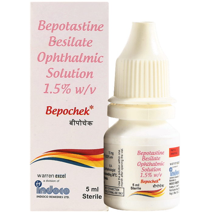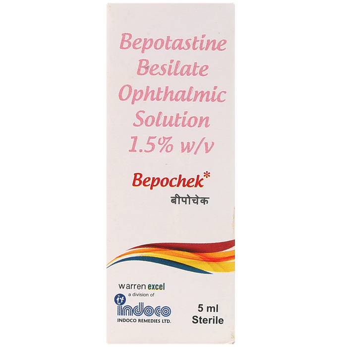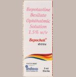 Bepochek 1.5% Eye Drop belongs to a group of medicines called antihistamines. It is used in the treatment of itching associated with inflammation in the eyes (redness and swelling) caused due to allergy. Follow your doctor’s instructions precisely for administering Bepochek 1.5% Eye Drop in the eye. It should be used regularly at evenly spaced time intervals as prescribed by your doctor. Do not skip any doses and finish the full course of treatment even if you feel better. Stopping the medicine too early may lead to returning or worsening.Commonly seen side effects seen with Bepochek 1.5% Eye Drop include eye irritation, headache, and nasopharyngitis. Consult your doctor if these side effects persist or if your condition worsens. It may cause blurring of your vision for a short time just after its use, so do not drive until your vision is clear.