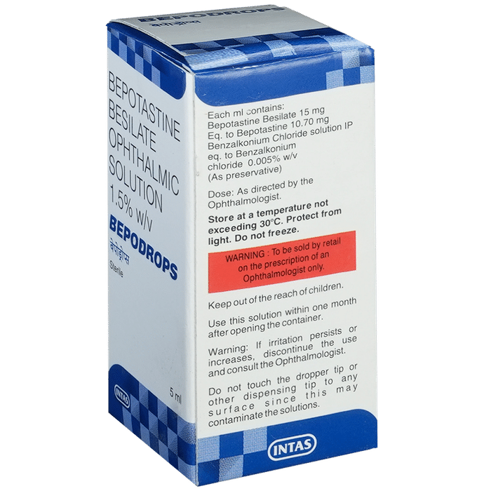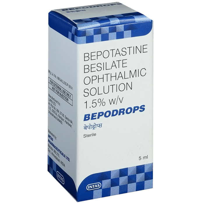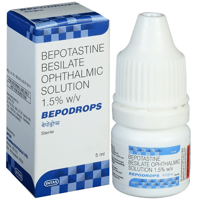 Bepodrops Ophthalmic Solution belongs to a group of medicines called antihistamines. It is used in the treatment of itching associated with inflammation in the eyes (redness and swelling) caused due to allergy. Follow your doctor’s instructions precisely for administering Bepodrops Ophthalmic Solution in the eye. It should be used regularly at evenly spaced time intervals as prescribed by your doctor. Do not skip any doses and finish the full course of treatment even if you feel better. Stopping the medicine too early may lead to returning or worsening.Commonly seen side effects seen with Bepodrops Ophthalmic Solution include eye irritation, headache, and nasopharyngitis. Consult your doctor if these side effects persist or if your condition worsens. It may cause blurring of your vision for a short time just after its use, so do not drive until your vision is clear.
