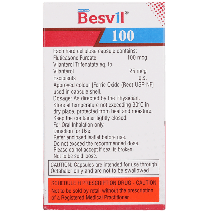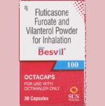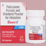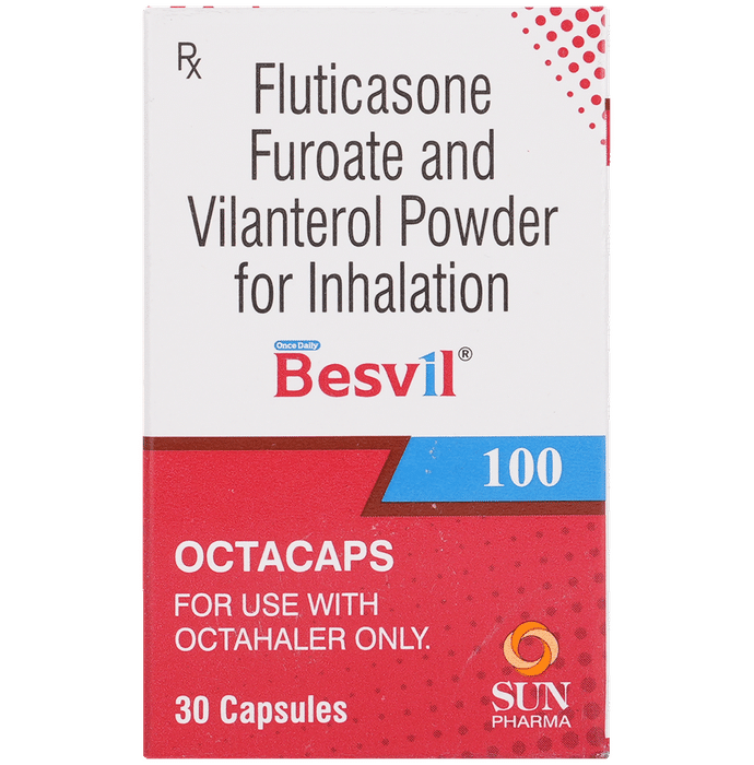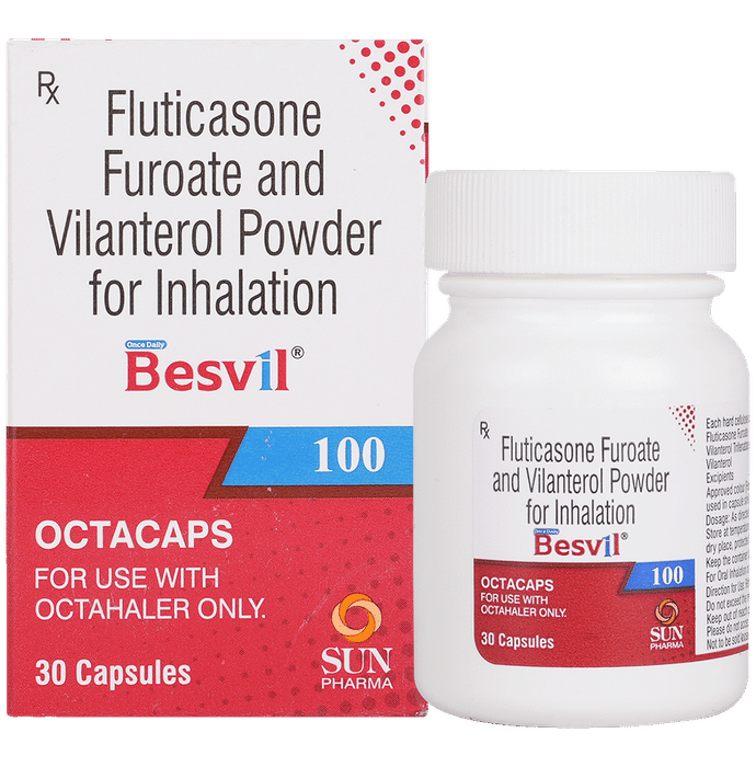 description:Besvil 100 Octacap is a combination of two medicines that opens the airways and makes it easier to breathe. It is used in the treatment of asthma (wheezing and shortness of breath) and chronic obstructive pulmonary disorder (a lung disorder in which the flow of air to the lungs is blocked). The effect of Besvil 100 Octacap may be noticeable after a few days but will only reach its maximum after a few weeks. This medicine must be used regularly for it to show its effect, so take it even if you don’t have any symptoms. If you stop taking it before the prescribed duration, your asthma and chronic obstructive pulmonary disorder (COPD) may worsen. It should not be used to relieve sudden asthma attacks. If an asthma attack occurs, use your quick-relief inhaler (reliever). To get the most benefits from this medicine, make sure you get your inhaler technique right; otherwise, the medicine won’t work well.The most common side effects of Besvil 100 Octacap are nasopharyngitis, upper respiratory tract infection, headache, fever, back pain, pneumonia, sinusitis, and cough. You can prevent some of these symptoms by rinsing your mouth and throat with water or brushing your teeth after using your inhaler. There are other, rarer side effects that can be serious. Talk to your doctor if you’re worried about them. In general, try to avoid situations which make your asthma worse (your triggers), and do not smoke.Ask your doctor whether it’s safe to take this medicine if you’re pregnant or breastfeeding. Before taking it, tell your doctor if you have any kidney or liver diseases so that they can prescribe a suitable dose for you.