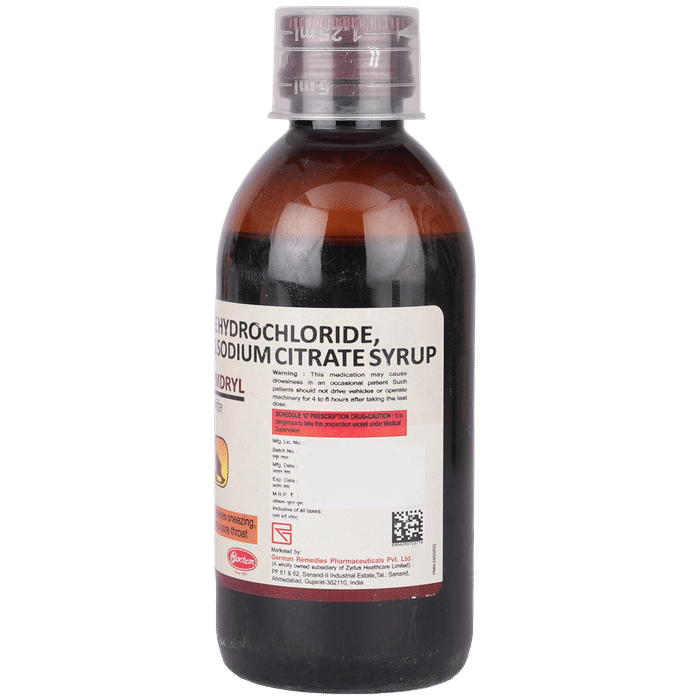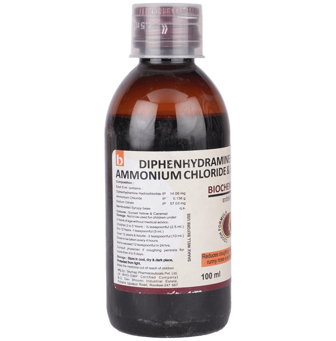 Biochemdryl Syrup is a combination medicine used to treat cough. It thins mucus in the nose, windpipe and lungs, making it easier to cough out. It also provides relief from runny nose, watery eyes and throat irritation. Biochemdryl Syrup is taken with or without food in a dose and duration as advised by the doctor. The dose you are given will depend on your condition and how you respond to the medicine. You should keep taking this medicine for as long as your doctor recommends. If you stop treatment too early your symptoms may come back and your condition may worsen. Let your doctor know about all other medications you are taking as some may affect, or be affected by this medicine.The most common side effects are stomach pain, thickened respiratory tract secretions, allergic reaction, and coordination impaired. Most of these are temporary and usually resolve with time. Contact your doctor straight away if you are at all concerned about any of these side effects. This medicine may cause dizziness and sleepiness, so do not drive or do anything that requires mental focus until you know how this medicine affects you. Avoid drinking alcohol while taking this medicine as it can make dizziness worse.Never support self-medication or recommend your medicine to another person. It is beneficial to have plenty of fluids while taking this medication. Before you start taking this medicine it is important to inform your doctor if you are suffering from liver or kidney disease.