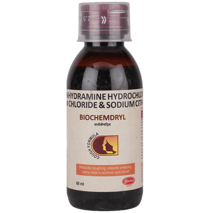 Biochemdryl Syrup is a combination medicine used to treat cough. It thins mucus in the nose, windpipe and lungs, making it easier to cough out. It also provides relief from runny nose, watery eyes and throat irritation.Biochemdryl Syrup is taken with or without food in a dose and duration as advised by the doctor. The dose you are given will depend on your condition and how you respond to the medicine. You should keep taking this medicine for as long as your doctor recommends. If you stop treatment too early your symptoms may come back and your condition may worsen. Let your doctor know about all other medications you are taking as some may affect, or be affected by this medicine.The most common side effects are stomach pain, thickened respiratory tract secretions, allergic reaction, and coordination impaired. Most of these are temporary and usually resolve with time. Contact your doctor straight away if you are at all concerned about any of these side effects. This medicine may cause dizziness and sleepiness, so do not drive or do anything that requires mental focus until you know how this medicine affects you. Avoid drinking alcohol while taking this medicine as it can make dizziness worse.Never support self-medication or recommend your medicine to another person. It is beneficial to have plenty of fluids while taking this medication. Before you start taking this medicine it is important to inform your doctor if you are suffering from liver or kidney disease.