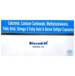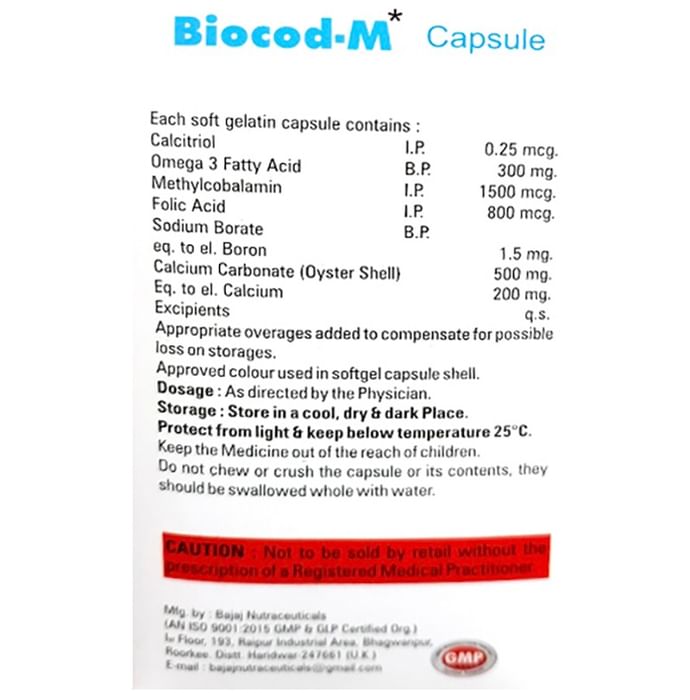 Biocod-M Capsule is a combination of vitamins and mineral supplements prescribed to treat vitamin and other nutritional deficiencies. It ensures the proper growth and functioning of the body and strengthens immunity. Biocod-M Capsule may be taken with or without food. It should be used in the dose and duration prescribed by your doctor. It is advised to take this medicine at a fixed time to avoid missing a dose.Biocod-M Capsule is usually a safe medicine with very minimal or no side effects. However, if you experience severe diarrhea, vomiting, or constipation, consult your doctor without delay.Before taking this medicine, tell your doctor if you have other health conditions. Inform your doctor if you are taking other medicines or are pregnant or breastfeeding. It is advised not to take alcohol after taking this medicine.