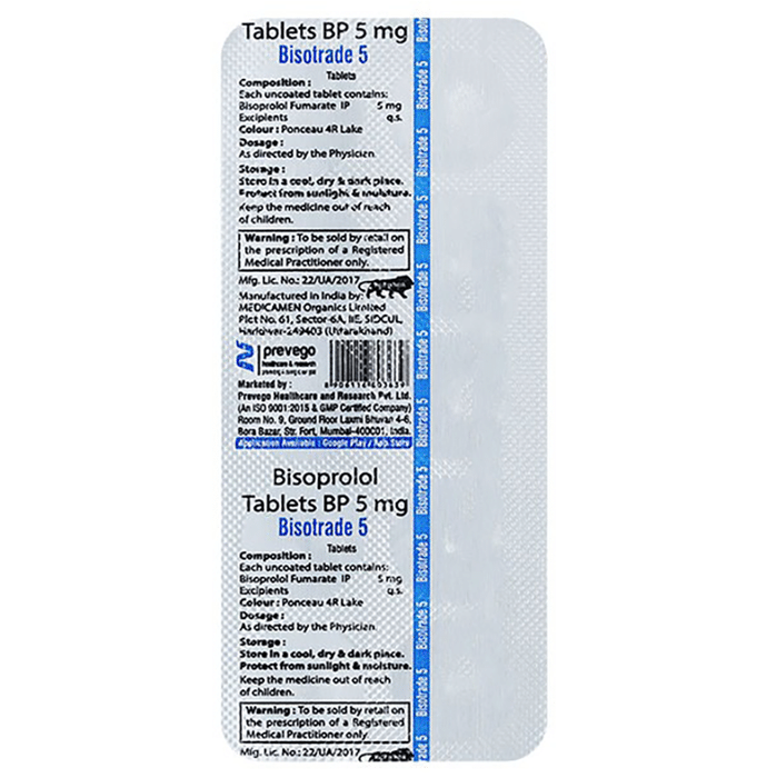 Bisotrade 5 Tablet belongs to a group of medicines called beta-blockers. It is used to treat high blood pressure (hypertension), angina (heart-related chest pain), irregular heart rhythms (arrhythmia). It also helps to prevent future heart attacks. Bisotrade 5 Tablet is also used to relieve the symptoms caused by an overactive thyroid gland. It may be prescribed alone or together with other medications. The dose and frequency depend on what you are taking it for and the severity of your condition. It may be taken empty stomach or with a meal, but take it regularly at the same time each day to get the most benefit. It may take several weeks before you get the full benefit of this medicine and you may need to take it for the rest of your life. However, it is important to continue taking it even if you feel well. Most people with high blood pressure do not feel ill and if you stop taking it, your condition may worsen.The main side effects of this medicine are fatigue, headache, slow heart rate, dizziness, and nausea. These are usually mild and short-lived. It may also cause shortness of breath or low blood pressure in some people. To reduce the risk of side effects your doctor will probably start the medicine at a low dose and gradually increase it. Consult your doctor if the side effects bother you or do not go away.Before taking it, let your doctor know if you have any liver problems. It may also not be suitable for people who have a slow heart rate, severe circulation problems, severe heart failure, or low blood pressure. Pregnant or breastfeeding mothers should also consult their doctor before taking it. You should have your blood pressure checked regularly to make sure that this medicine is working properly. Avoid drinking alcohol as it may increase certain side effects.