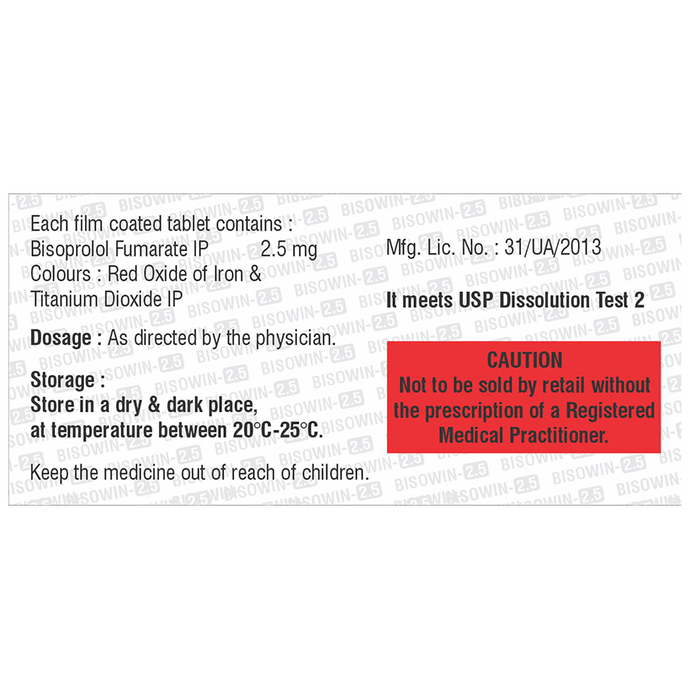 Bisowin 2.5 Tablet belongs to a group of medicines called beta-blockers. It is used to treat high blood pressure (hypertension), angina (heart-related chest pain), irregular heart rhythms (arrhythmia). It also helps to prevent future heart attacks. Bisowin 2.5 Tablet is also used to relieve the symptoms caused by an overactive thyroid gland. It may be prescribed alone or together with other medications. The dose and frequency depend on what you are taking it for and the severity of your condition. It may be taken empty stomach or with a meal, but take it regularly at the same time each day to get the most benefit. It may take several weeks before you get the full benefit of this medicine and you may need to take it for the rest of your life. However, it is important to continue taking it even if you feel well. Most people with high blood pressure do not feel ill and if you stop taking it, your condition may worsen.The main side effects of this medicine are fatigue, headache, slow heart rate, dizziness, and nausea. These are usually mild and short-lived. It may also cause shortness of breath or low blood pressure in some people. To reduce the risk of side effects your doctor will probably start the medicine at a low dose and gradually increase it. Consult your doctor if the side effects bother you or do not go away.Before taking it, let your doctor know if you have any liver problems. It may also not be suitable for people who have a slow heart rate, severe circulation problems, severe heart failure, or low blood pressure. Pregnant or breastfeeding mothers should also consult their doctor before taking it. You should have your blood pressure checked regularly to make sure that this medicine is working properly. Avoid drinking alcohol as it may increase certain side effects.