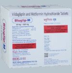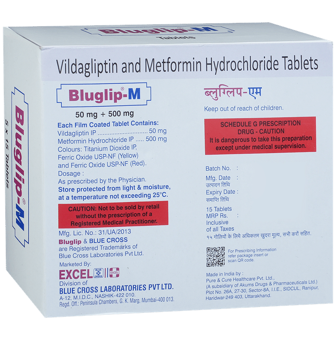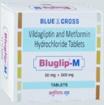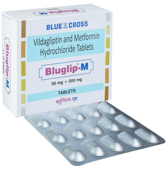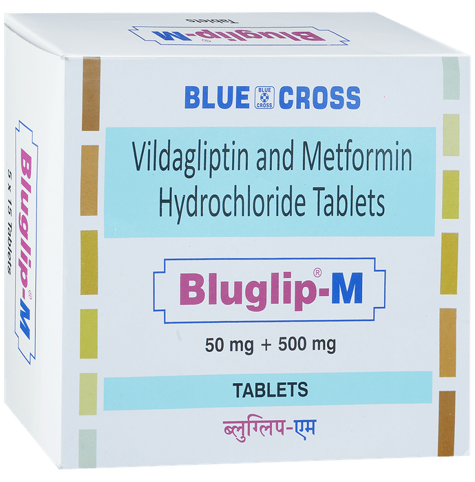 description:Bluglip M 500mg/50mg Tablet is a combination of two medicines that control high blood sugar levels in people with type 2 diabetes mellitus. This helps prevent serious complications of diabetes such as kidney damage and blindness and may also reduce your chances of having a heart attack or stroke. Bluglip M 500mg/50mg Tablet can be prescribed alone or together with other diabetes medications. All diabetes medicines work best when used along with a healthy diet and regular exercise. The dose you are given will depend on your condition, blood sugar levels, and what other medicines you are taking. Taking it with meals helps to reduce the chances of developing an upset stomach.You should take it regularly, at the same time each day, to get the most benefit and you should not stop unless your doctor recommends it. It is controlling your blood sugar levels and helping to prevent serious complications in the future. It is important to stay on the diet and exercise program recommended by your doctor while taking this medicine. Your lifestyle plays a big part in controlling diabetes.The most common side effects of taking this medicine include diarrhea, nausea, vomiting, upset stomach, headache, sore throat, weakness, gastroesophageal reflux disease, excessive sweating, and decreased appetite. Low blood sugar level (hypoglycemia) is a possible side effect if you are also taking other diabetes medicines like insulin or sulphonylurea, so you need to know how to recognize and deal with it.This medicine is not suitable for everyone. Before taking it, you should let your doctor know if you have ever had kidney, liver, or heart disease, problems with your pancreas, or if you drink a lot of alcohol. Pregnant or breastfeeding women should also consult their doctor before taking this medicine. Some other medicines can affect this one so tell your doctor about all the medicines you are taking to make sure you are safe. You should try to avoid drinking alcohol as it lowers blood glucose. Your doctor will check your kidney function and blood sugar levels before and during treatment.