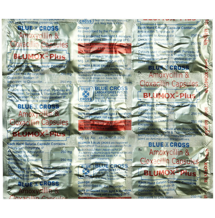 Marketer:Blue Cross Laboratories Ltd,Composition:Amoxycillin (250mg) + Cloxacillin (250mg), medicine_typedrugs,Packaging Detail:strip of 15 capsules,          Package:Strip,Qty:15,Product Form:Capsule, prescription_required:Prescription Required,primary_use: