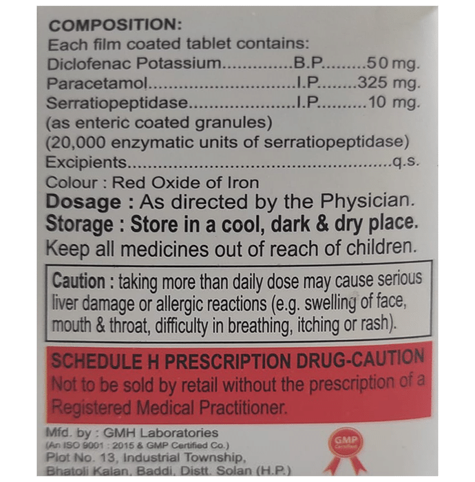 Marketer:Symantec Healthcare Pvt Ltd,Composition:Diclofenac (50mg) + Paracetamol (325mg) + Serratiopeptidase (10mg), medicine_typedrugs,Packaging Detail:strip of 10 tablets,                   Package:Strip,Qty:10,Product Form:Tablet, prescription_required:Prescription Required,primary_use: