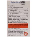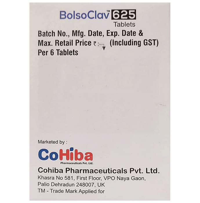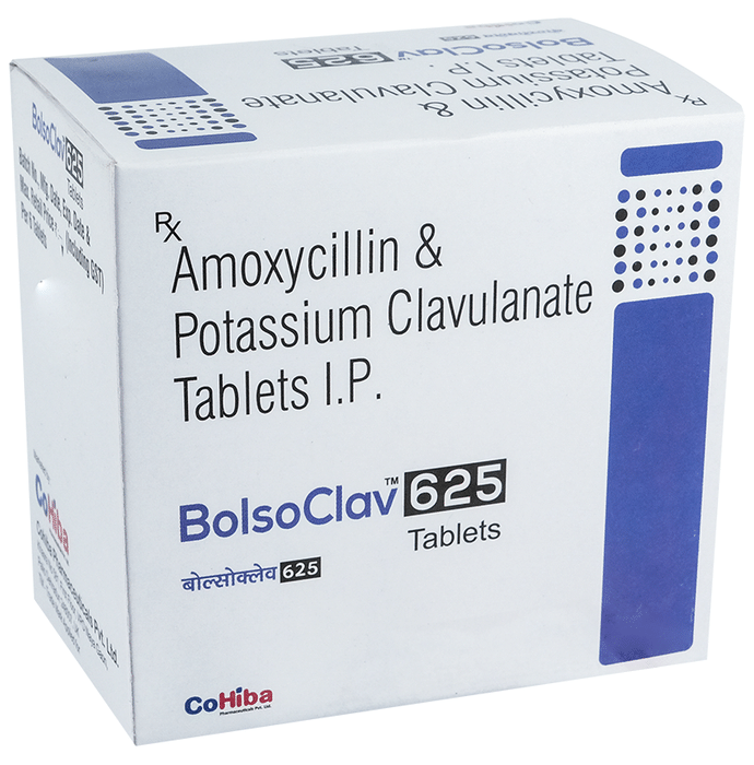 description:Bolsoclav 625 Tablet is an antibiotic that helps your body fight infections caused by bacteria. It is used to treat infections of the lungs (e.g., pneumonia), ear, nasal sinus, urinary tract, skin, and soft tissue. It will not work for viral infections such as the common cold. Bolsoclav 625 Tablet is best taken with a meal to reduce the chance of a stomach upset. You should take it regularly at evenly spaced intervals as per the schedule prescribed by your doctor. Taking it at the same time daily will help you remember to take it. The dose will depend on what you are being treated for, but you should always complete an entire course of this antibiotic as your doctor prescribes. Please do not stop taking it until you have finished, even when you feel better. If you stop taking it early, some bacteria may survive, and the infection may return or worsen.The most common side effects of Bolsoclav 625 Tablet include nausea, diarrhea, vomiting, fungal infections of the mouth, skin fold or vagina, skin rashes, and vaginitis. These are usually mild, but let your doctor know if they bother you or will not go away.Before taking it, let your doctor know if you are allergic to any antibiotics or have kidney or liver problems. You should also inform your healthcare team about all other medicines you are taking as they may affect or be affected by Bolsoclav 625 Tablet. This medicine is generally considered safe to use during pregnancy and breastfeeding if prescribed by a doctor.