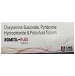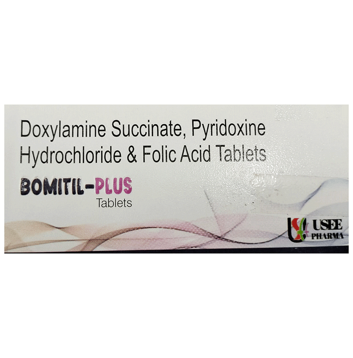 description:Bomitil-Plus Tablet is a combination medicine used in the treatment of nausea or vomiting during pregnancy. It blocks signals to reach the brain that trigger the feeling of nausea and vomiting. Bomitil-Plus Tablet is taken with or without food in a dose and duration as advised by the doctor. The dose you are given will depend on your condition and how you respond to the medicine. You should keep taking this medicine for as long as your doctor recommends. If you stop treatment too early your symptoms may come back and your condition may worsen. Let your healthcare team know about all other medications you are taking as some may affect, or be affected by this medicine.The most common side effects are dryness in the mouth, constipation, and lightheadedness. Most of these are temporary and usually resolve with time. Contact your doctor straight away if you are at all concerned about any of these side effects. This medicine can also cause dizziness and sleepiness, so do not drive or do anything that requires mental focus until you know how this medicine affects you. Avoid drinking alcohol while taking this medicine as it can worsen your sleepiness.