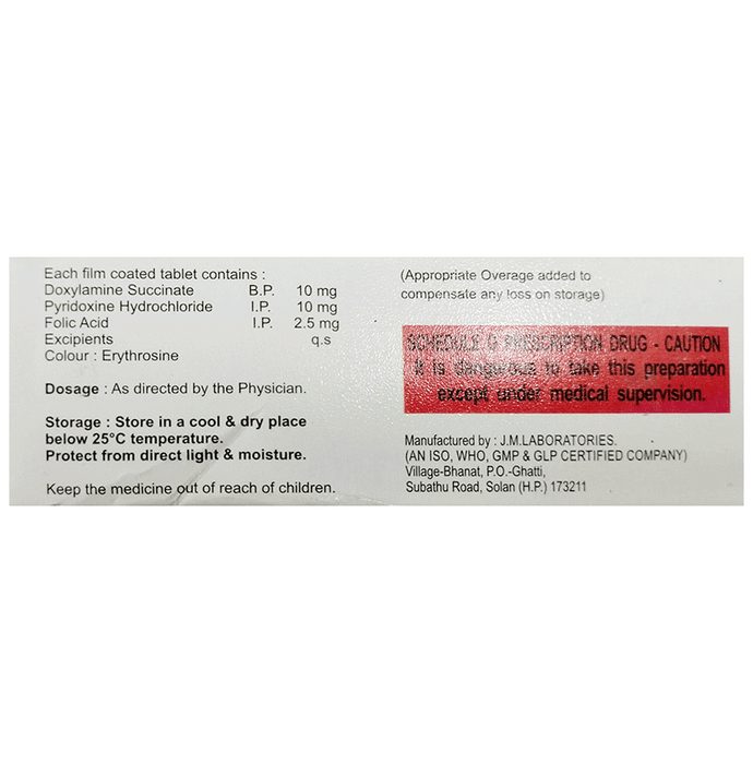 Marketer:Usee Pharma,Composition:Doxylamine (10mg) + Vitamin B6 (Pyridoxine) (10mg) + Folic Acid (2.5mg), medicine_typedrugs,Packaging Detail:strip of 10 tablets,          Package:Strip,Qty:10,Product Form:Tablet, prescription_required:Prescription Required,primary_use:
