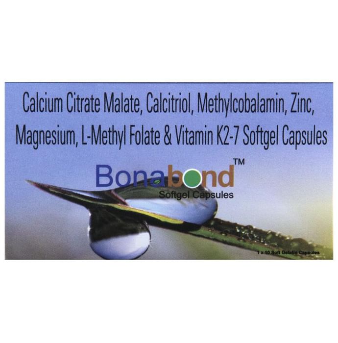 description:Bonabond Soft Gelatin Capsule is a combination of medicines that is used to treat nutritional deficiencies. It helps in proper growth and development of cells, bone and improves heart health. It also helps in protein synthesis and production of blood cells like red blood cells or white blood cells and boosts immunity. Bonabond Soft Gelatin Capsule may be taken with or without food. It should be used in the dose and duration as prescribed by your doctor. It is advised to take this medicine at a fixed time.This medicine should not be taken more than the recommended dose. It is usually a safe medicine with very minimal or no side effects. However, if you experience severe diarrhea, vomiting, or constipation, you should consult your doctor without delay.Before taking this medicine, tell your doctor if you have any other health conditions. Inform your doctor if you are taking any other medicines or if you are pregnant or breastfeeding.