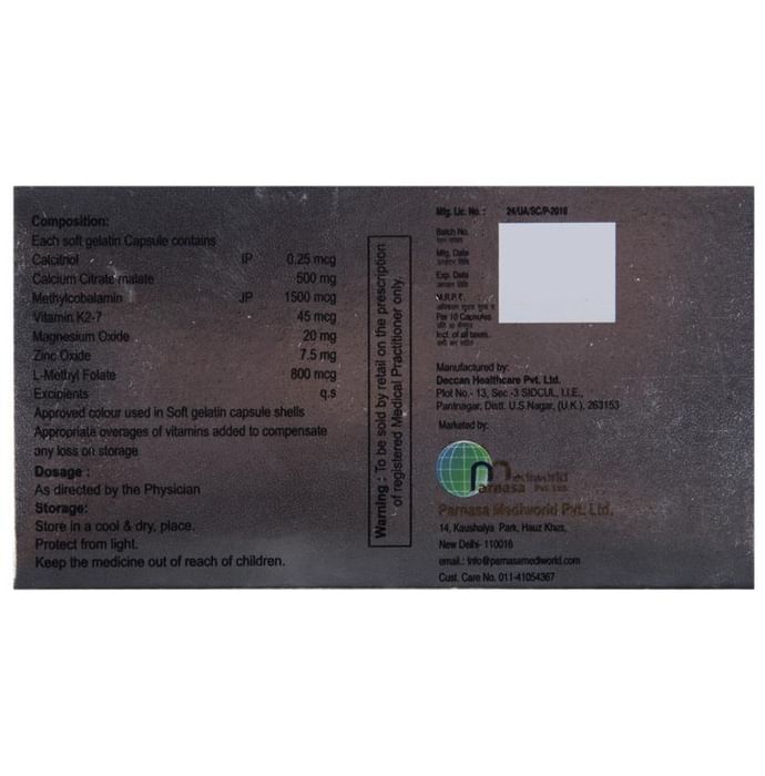 Marketer:Parnasa Mediworld Pvt Ltd,Composition:Calcitriol (0.25mcg) + Calcium citrate (500mg) + Vitamin K2-7 (45mcg) + Methylcobalamin (1500mcg) + Zinc Oxide (7.5mg) + Magnesium Oxide (20mg) + L-Methyl Folate (800mcg), medicine_typedrugs,Packaging Detail:strip of 10 soft gelatin capsules,                   Package:Strip,Qty:10,Product Form:Soft Gelatin Capsule, prescription_required:Prescription Required,primary_use: