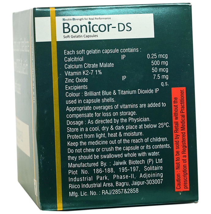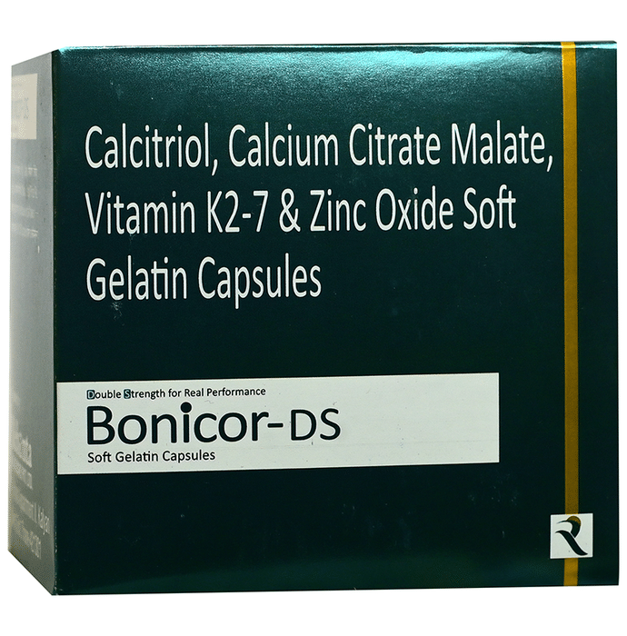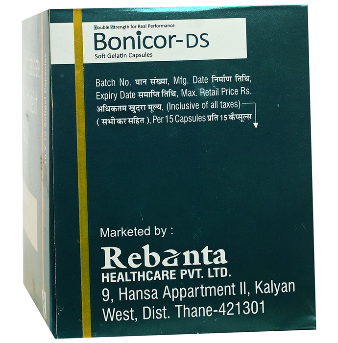 description:Bonicor-DS Soft Gelatin Capsule is a combination medicine used to treat nutritional deficiencies. It is normally prescribed when your diet alone cannot provide the necessary supplements your body needs. It fulfills the deficiency to prevent related diseases. It also ensures proper growth and functioning of the body. Bonicor-DS Soft Gelatin Capsule may be taken with or without food. Take it in the dose and duration advised by the doctor. Take it regularly at the same time each day to get maximum benefits from it. Do not take it more than or longer than prescribed by the doctor, as that may cause harmful effects.It is generally safe medicine with little or no side effects. However, if you experience side effects which you think is caused by the medicine, let your doctor know. It is important to let your doctor know if you have any preexisting medical conditions or if you are taking any other medications. This will ensure your safety to use this medicine.
