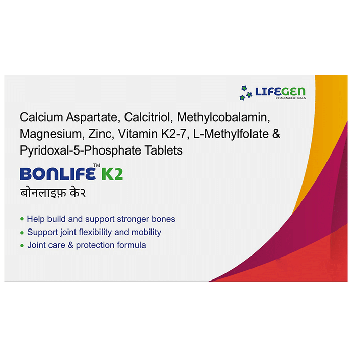 Marketer:Lifegen Pharmaceuticals,Composition:Calcium Aspartate (1120mg) + Calcitriol (0.25mcg) + Methylcobalamin (1500mcg) + Magnesium (50mg) + Zinc (7.5mg) + Vitamin K2-7 (45mcg) + L-Methyltetrahydrofolate Calcium (1mg) + Pyridoxal-5-phosphate (0.5mg), medicine_typedrugs,Packaging Detail:strip of 10 tablets,          Package:Strip,Qty:10,Product Form:Tablet, prescription_required:Prescription Required,primary_use: