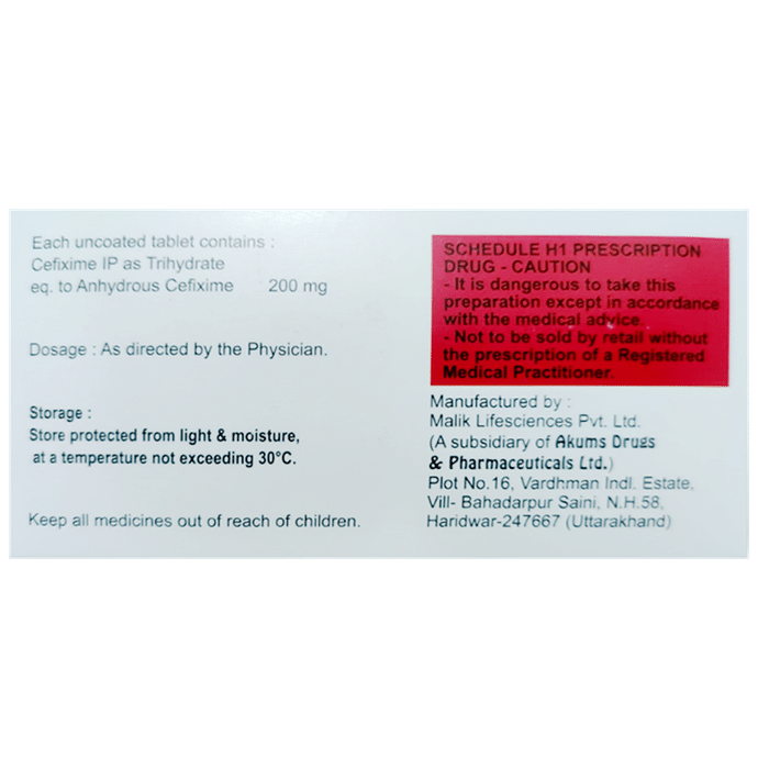 Marketer:Bon Merci Life Sciences,Composition:Cefixime (200mg), medicine_typedrugs,Packaging Detail:strip of 10 tablets,          Package:Strip,Qty:10,Product Form:Tablet, prescription_required:Prescription Required,primary_use: