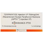 description:Bonrange-PTH Injection is a man-made version of parathyroid hormone used to treat men and postmenopausal women who have severe osteoporosis with a high risk of fractures. It works by stimulating new bone formation, which improves bone density and decreases the risk of spinal fractures. Bonrange-PTH Injection should be injected under the skin or given by a healthcare professional. You should use it regularly and at the same time each day to get the maximum benefit from it. Usually, it is recommended to take it for a maximum period of 2 years. However, follow the doctor’s advice and complete the course even if you feel better. It should be stored in the refrigerator at a temperature of 2°C to 8°C.Some common side effects of this medicine include joint pain, injection site reactions (such as pain, swelling, and redness) and leg cramps. consult with your doctor if any of these bother you or do not go away. Before taking this medicine, let your doctor know if you have kidney stones or any other kidney problems, as it can cause an increase in the amount of calcium in blood or urine. Pregnant and breastfeeding mothers should also consult with their doctors before taking this medicine. Your doctor may advise a bone scan to monitor the progress of your treatment.