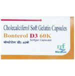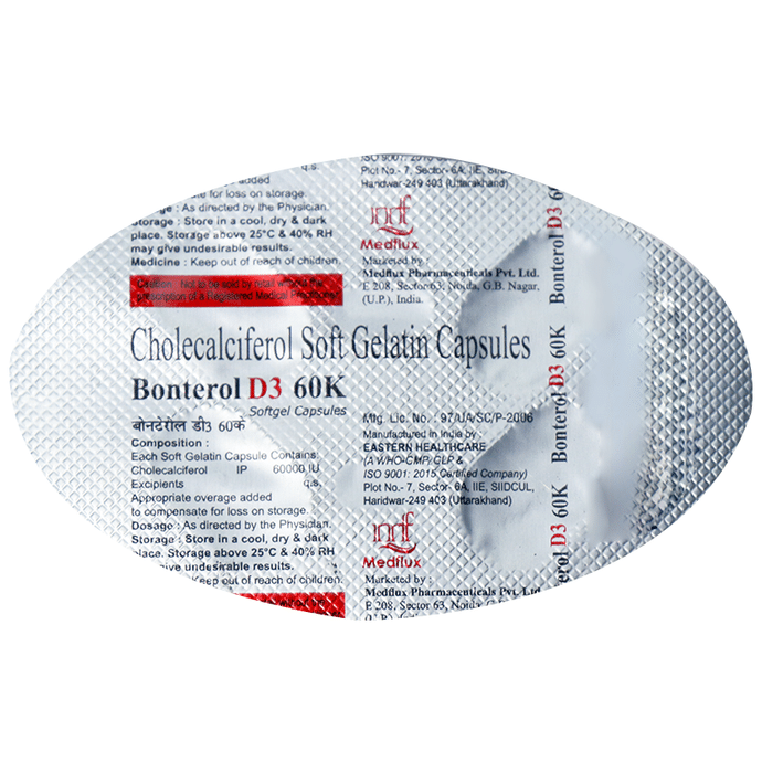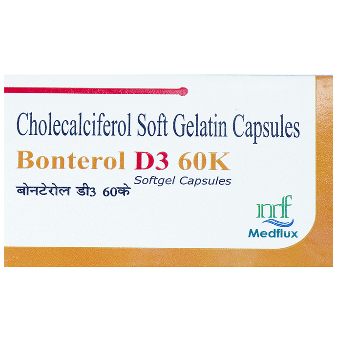 description:Bonterol D3 60K Softgel Capsule is used to treat vitamin D deficiency and osteoporosis. It helps the body absorb calcium, which is essential for maintaining strong and healthy bones. It is used when the diet does not provide enough. Bonterol D3 60K Softgel Capsule should be taken as directed by your doctor. It is best taken with or after food as this helps your body absorb it, and you should take it regularly to get the most benefit. If you are using it to treat osteoporosis, you will also be prescribed other medicines. This medicine may be only part of a complete treatment program that includes making changes to your diet and taking calcium and vitamin supplements. Learn about the foods you should eat to ensure you get enough calcium and vitamin D.Bonterol D3 60K Softgel Capsule has few side effects, and none are common. If you take too much, you may feel weakness, muscle pain, or a metallic taste in your mouth. If you experience any such side effects, speak with your doctor. They may be able to help you reduce or treat the symptoms.Before taking this medicine, tell your doctor if you have high calcium levels in your blood or if you have any heart, kidney, or liver disease. Some other medicines can decrease the absorption of vitamin D3, so let your doctor know all other medicines you are taking to make sure you are safe. This medicine may help during pregnancy when your body needs more vitamin D, but too much could harm your baby. Discuss with your doctor.