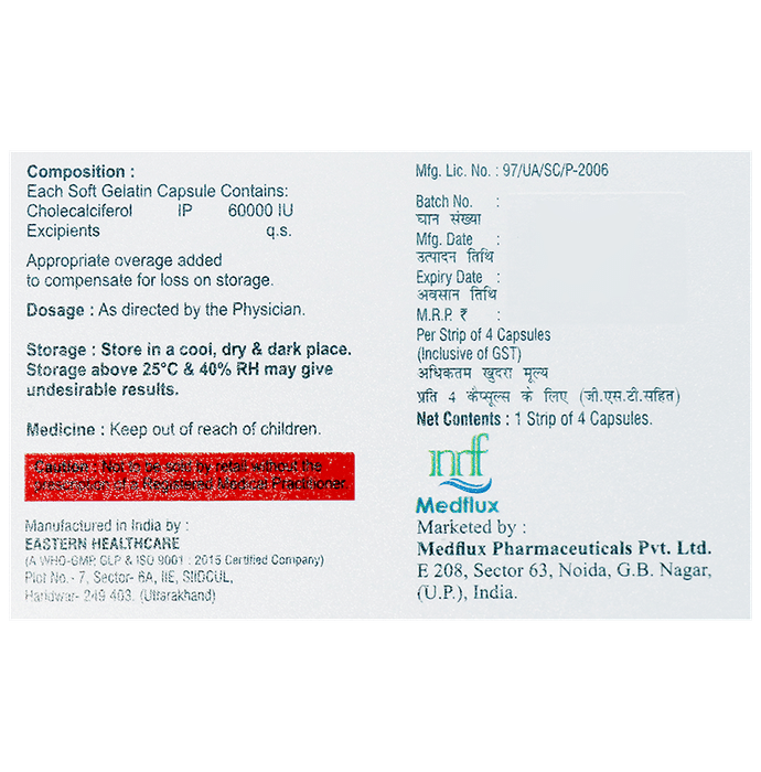 Marketer:Medflux Pharmaceuticals Pvt Ltd,Composition:Vitamin D3 (60000IU), medicine_typedrugs,Packaging Detail:strip of 4 soft gelatin capsules,          Package:Strip,Qty:4,Product Form:Soft Gelatin Capsule, prescription_required:,primary_use: