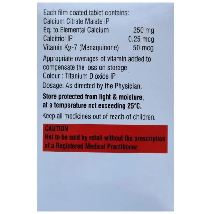 Marketer:Energize Pharmaceuticals (P) Ltd.,Composition:Calcitriol (0.25mcg) + Calcium Citrate Malate (250mg) + Vitamin K2-7 (50mcg), medicine_typedrugs,Packaging Detail:strip of 10 tablets,                   Package:Strip,Qty:10,Product Form:Tablet, prescription_required:Prescription Required,primary_use: