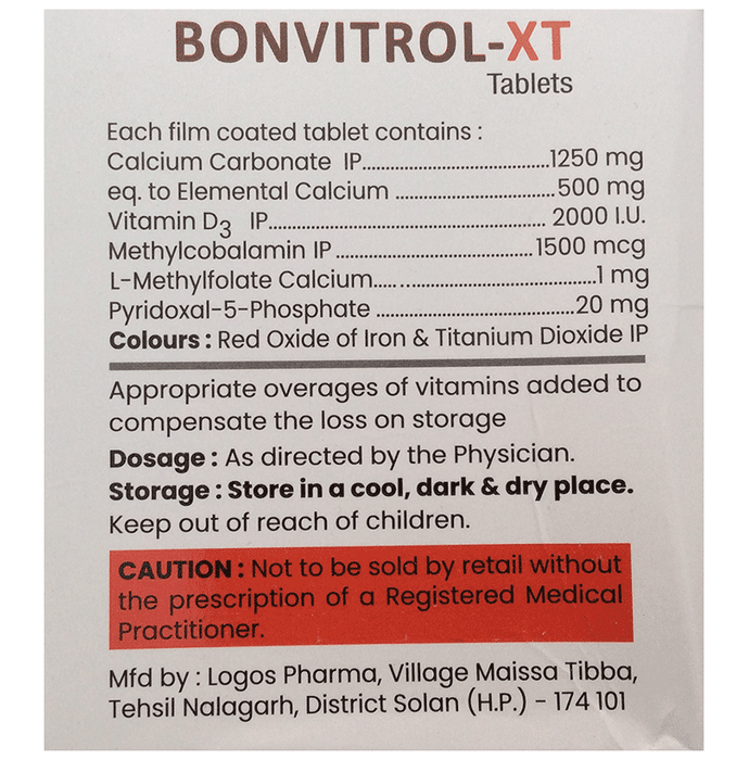 description:Bonvitrol-XT Tablet is a combination medicine used to treat nutritional deficiencies. It is normally prescribed when your diet alone cannot provide the necessary supplements your body needs. It fulfills the deficiency to prevent related diseases. It also ensures proper growth and functioning of the body. Bonvitrol-XT Tablet may be taken with or without food. Take it in the dose and duration advised by the doctor. Take it regularly at the same time each day to get maximum benefits from it. Do not take it more than or longer than prescribed by the doctor, as that may cause harmful effects.It is generally safe medicine with little or no side effects. However, some people may experience dryness in the mouth, nausea, abdominal pain, constipation, and headache on taking the medicine. If you experience any such side effects which do not go away on their own or get worse, let your doctor know. It is important to let your doctor know if you have any preexisting medical conditions or if you are taking any other medications. This will ensure your safety to use this medicine.