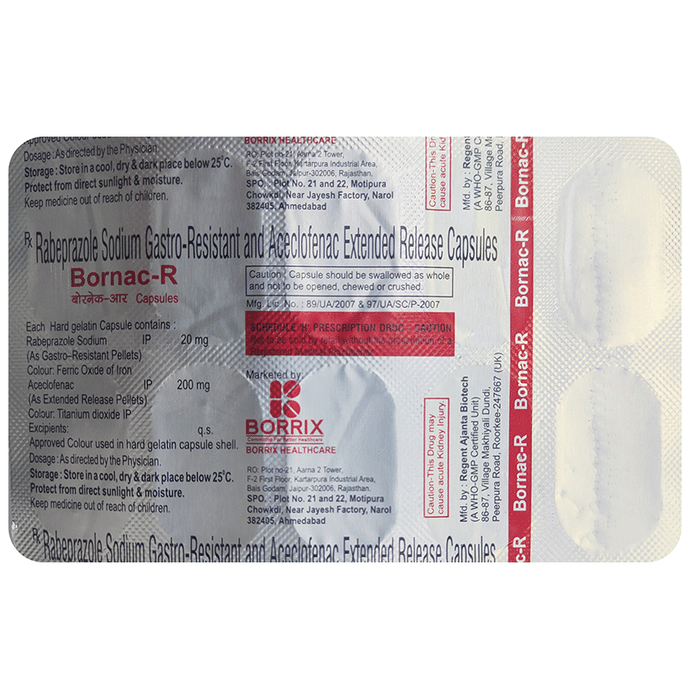 description:Bornac-R Capsule ER is a combination of two medicines. It is used to reduce pain and inflammation in conditions like rheumatoid arthritis, ankylosing spondylitis, and osteoarthritis. It may also be used to relieve muscle pain, back pain, toothache, or pain in the ear and throat. Bornac-R Capsule ER can be taken with or without food. The dose will depend on what you are taking it for and how well it helps your symptoms. You should take it as advised by your doctor. Do not take more or use it for a longer duration than recommended by the doctor.The most common side effects of this medicine include nausea, flatulence, indigestion, diarrhea, abdominal pain, and constipation. If any of these side effects bother you or get worse, you should speak to your doctor. Your doctor may be able to suggest ways of preventing or reducing the side effects.Before taking it, you should let your doctor know if you have a history of ulcer or bleeding in your stomach, high blood pressure, or have any trouble with your heart, kidneys, or liver. Let your doctor also know about all the other medicines you are taking because they may affect, or be affected by, this medicine.Pregnant or breastfeeding women should consult their doctor before starting treatment. You should also avoid drinking alcohol while you are taking this medicine, as alcohol can cause excessive drowsiness.