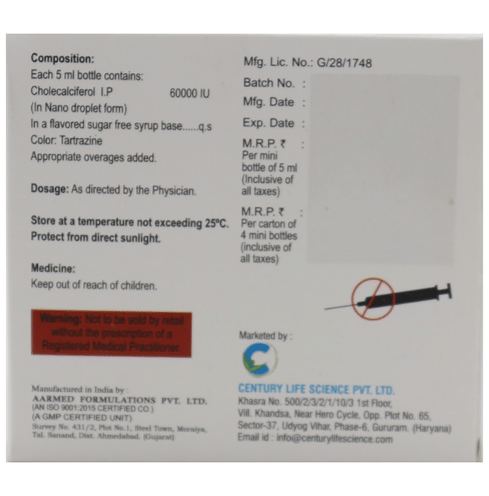 Marketer:Century Life Science,Composition:Vitamin D3 (60000IU), medicine_typedrugs,Packaging Detail:box of 4 bottles,          Package:Box,Qty:4,Product Form:Bottle, prescription_required:,primary_use: