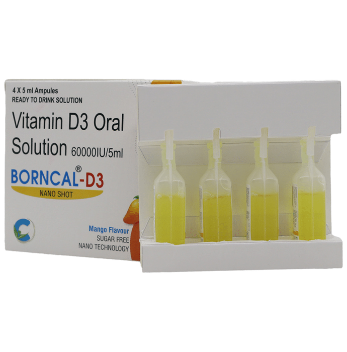 description:Borncal D3 Nano Shot (5ml Each) Mango Sugar Free is used to treat vitamin D deficiency and osteoporosis. It helps the body absorb calcium, which is essential for maintaining strong and healthy bones. It is used when the diet does not provide enough. Borncal D3 Nano Shot (5ml Each) Mango Sugar Free should be taken as directed by your doctor. It is best taken with or after food as this helps your body absorb it, and you should take it regularly to get the most benefit. If you are using it to treat osteoporosis, you will also be prescribed other medicines. This medicine may be only part of a complete treatment program that includes making changes to your diet and taking calcium and vitamin supplements. Learn about the foods you should eat to ensure you get enough calcium and vitamin D.Borncal D3 Nano Shot (5ml Each) Mango Sugar Free has few side effects, and none are common. If you take too much, you may feel weakness, muscle pain, or a metallic taste in your mouth. If you experience any such side effects, speak with your doctor. They may be able to help you reduce or treat the symptoms.Before taking this medicine, tell your doctor if you have high calcium levels in your blood or if you have any heart, kidney, or liver disease. Some other medicines can decrease the absorption of vitamin D3, so let your doctor know all other medicines you are taking to make sure you are safe. This medicine may help during pregnancy when your body needs more vitamin D, but too much could harm your baby. Discuss with your doctor.