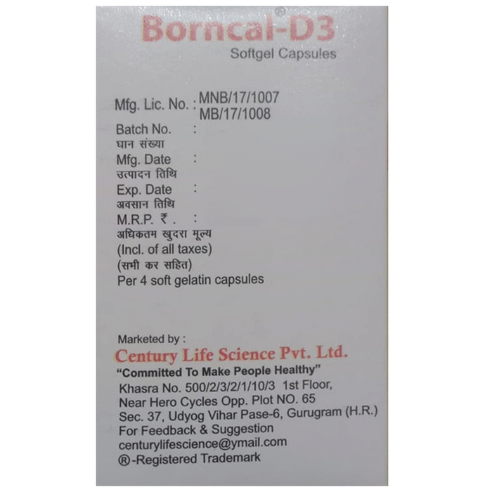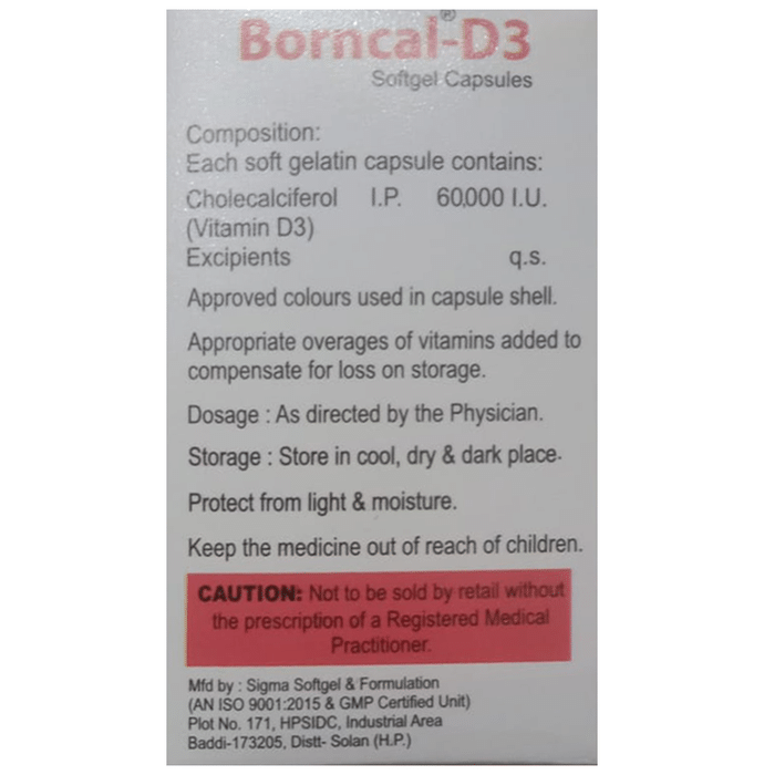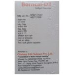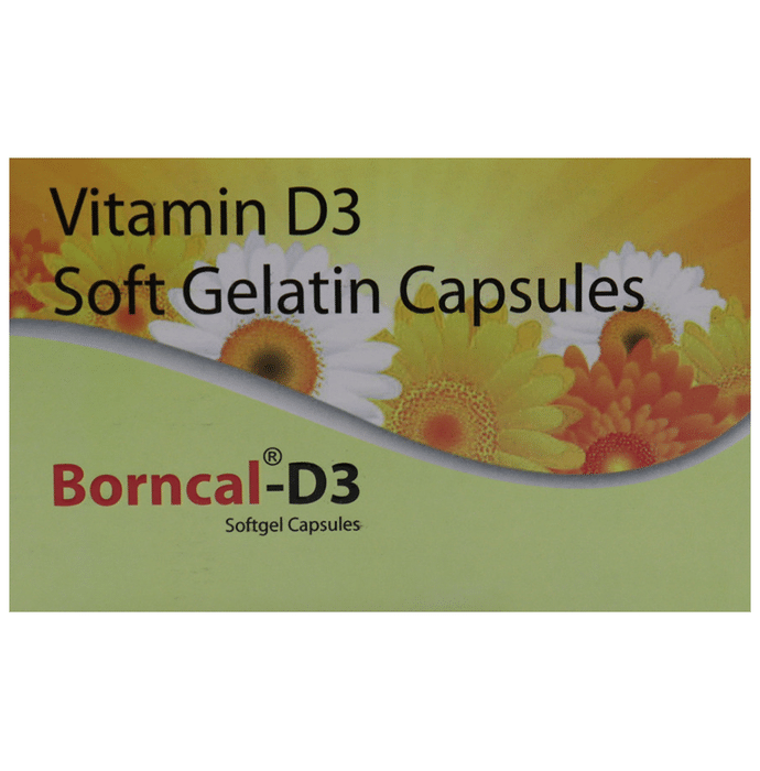 description:Borncal-D3 Softgel Capsule is used to treat vitamin D deficiency and osteoporosis. It helps the body absorb calcium, which is essential for maintaining strong and healthy bones. It is used when the diet does not provide enough. Borncal-D3 Softgel Capsule should be taken as directed by your doctor. It is best taken with or after food as this helps your body absorb it, and you should take it regularly to get the most benefit. If you are using it to treat osteoporosis, you will also be prescribed other medicines. This medicine may be only part of a complete treatment program that includes making changes to your diet and taking calcium and vitamin supplements. Learn about the foods you should eat to ensure you get enough calcium and vitamin D.Borncal-D3 Softgel Capsule has few side effects, and none are common. If you take too much, you may feel weakness, muscle pain, or a metallic taste in your mouth. If you experience any such side effects, speak with your doctor. They may be able to help you reduce or treat the symptoms.Before taking this medicine, tell your doctor if you have high calcium levels in your blood or if you have any heart, kidney, or liver disease. Some other medicines can decrease the absorption of vitamin D3, so let your doctor know all other medicines you are taking to make sure you are safe. This medicine may help during pregnancy when your body needs more vitamin D, but too much could harm your baby. Discuss with your doctor.