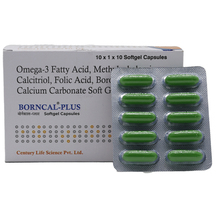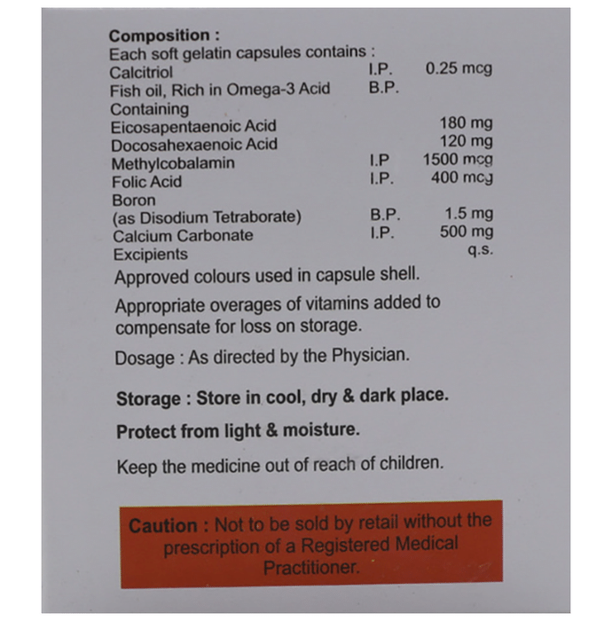 Marketer:Century Life Science,Composition:Calcitriol (0.25mcg) + Calcium Carbonate (500mg) + Omega-3 fatty acid (300mg) + Methylcobalamin (1500mcg) + Folic Acid (400mg) + Boron (1.5mg), medicine_typedrugs,Packaging Detail:strip of 10 capsules,          Package:Strip,Qty:10,Product Form:Capsule, prescription_required:Prescription Required,primary_use: