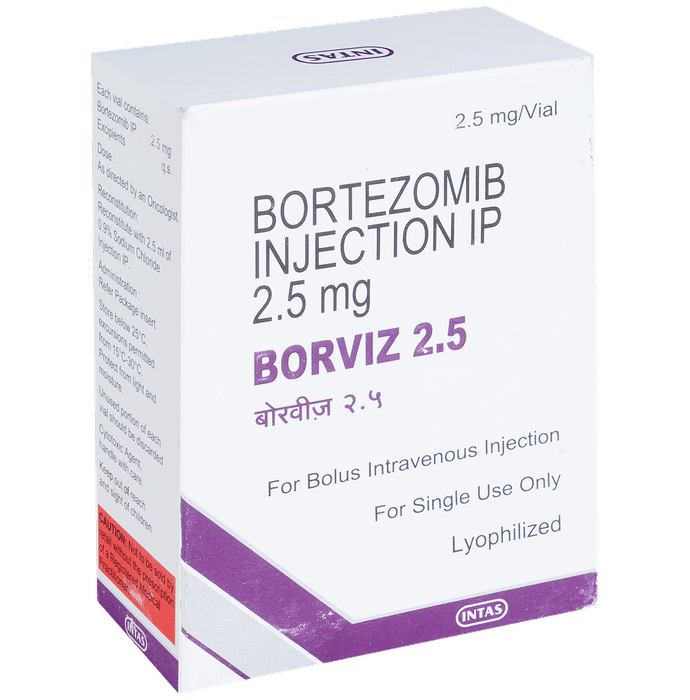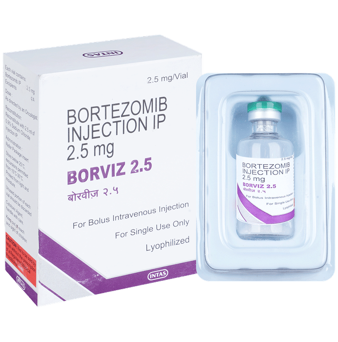 description:Borviz 2.5 Injection is used in the treatment of multiple myeloma and mantle-cell lymphoma. It shows its working by stopping or slowing down the growth of cancer cells. Borviz 2.5 Injection is given as an injection by a qualified medical professional. Your doctor will decide what dose is necessary and how often you need to take it. This will depend on what you are being treated for and may change from time to time. You should take it exactly as your doctor has advised. Taking it in the wrong way or taking too much can cause very serious side effects. It may take several weeks or months for you to see or feel the benefits but do not stop taking it unless your doctor tells you to.Fatigue, nausea, vomiting, and loss of appetite are some common side effects of this medicine. You may be advised to drink plenty of fluids every day during the treatment. You should not drive or operate machinery as medicine may cause tiredness and dizziness. This medicine may reduce the number of blood cells (decrease red blood and white blood cells) in your blood, thereby, increasing the susceptibility to infections. Regular blood tests are required to check your blood cells along with heart, liver, and blood uric acid levels.Before taking Borviz 2.5 Injection, consult with your doctor if you have any liver, kidney, heart disease or bleeding problem. It is important to consult a doctor if you develop symptoms like memory loss or trouble in thinking. Many other medicines can affect, or be affected by, this medicine so let your healthcare team know all medications you are using. This medicine is not recommended during pregnancy or while breastfeeding. The use of effective contraception by both males and females during treatment is important to avoid pregnancy.
