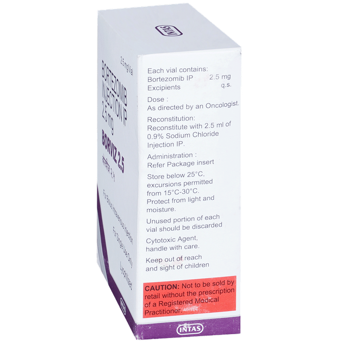 Marketer:Intas Pharmaceuticals Ltd,Composition:Bortezomib (2.5mg), medicine_typedrugs,Packaging Detail:vial of 1 Injection,          Package:Vial,Qty:1,Product Form:Injection, prescription_required:Prescription Required,primary_use: