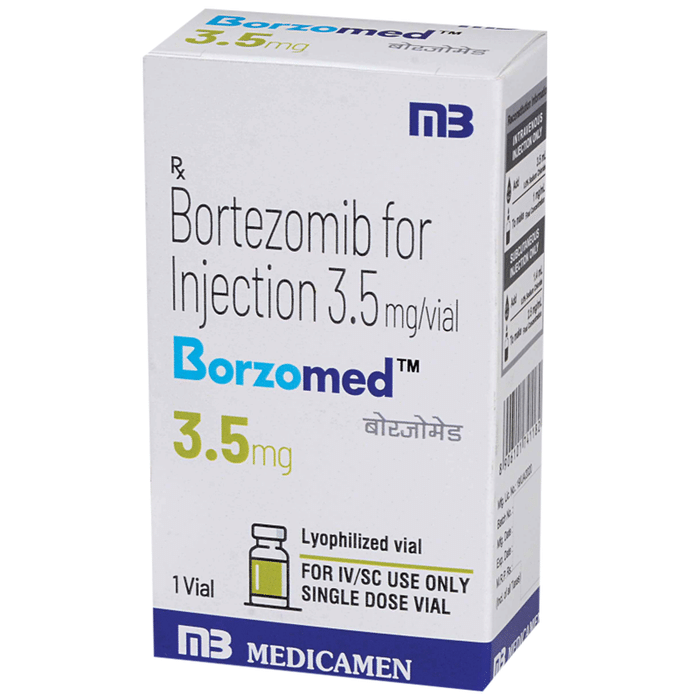 description:Borzomed 3.5mg Injection is used in the treatment of multiple myeloma and mantle-cell lymphoma. It shows its working by stopping or slowing down the growth of cancer cells. Borzomed 3.5mg Injection is given as an injection by a qualified medical professional. Your doctor will decide what dose is necessary and how often you need to take it. This will depend on what you are being treated for and may change from time to time. You should take it exactly as your doctor has advised. Taking it in the wrong way or taking too much can cause very serious side effects. It may take several weeks or months for you to see or feel the benefits but do not stop taking it unless your doctor tells you to.Fatigue, nausea, vomiting, and loss of appetite are some common side effects of this medicine. You may be advised to drink plenty of fluids every day during the treatment. You should not drive or operate machinery as medicine may cause tiredness and dizziness. This medicine may reduce the number of blood cells (decrease red blood and white blood cells) in your blood, thereby, increasing the susceptibility to infections. Regular blood tests are required to check your blood cells along with heart, liver, and blood uric acid levels.Before taking Borzomed 3.5mg Injection, consult with your doctor if you have any liver, kidney, heart disease or bleeding problem. It is important to consult a doctor if you develop symptoms like memory loss or trouble in thinking. Many other medicines can affect, or be affected by, this medicine so let your healthcare team know all medications you are using. This medicine is not recommended during pregnancy or while breastfeeding. The use of effective contraception by both males and females during treatment is important to avoid pregnancy.